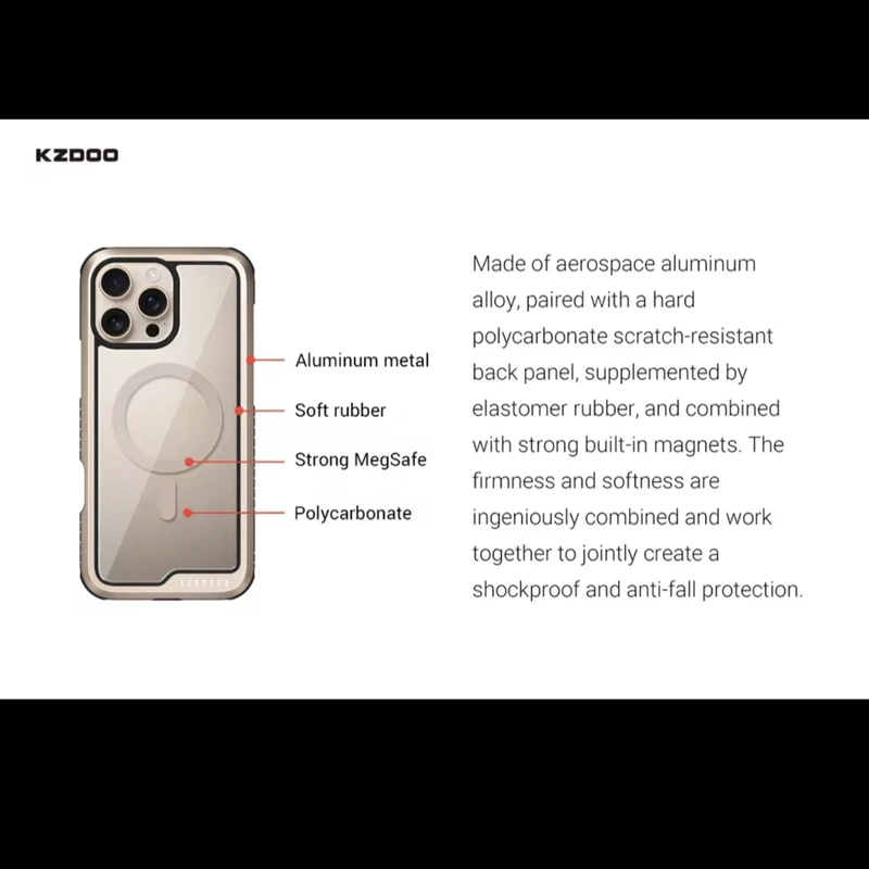 کاور K.Doo (KZDOO) Mag Ares Sport از مواد اولیه با کیفیت و مرغوب تولید شده است تا کیفیتی استاندارد داشته باشد. به طوری که با لمس قاب، کیفیت بالای آن ملموس است. قسمت پشت کاور، از مواد شفاف PC ساخته شده است که دور تا دور آن را نواری مشکی رنگ فرا گرفته است.